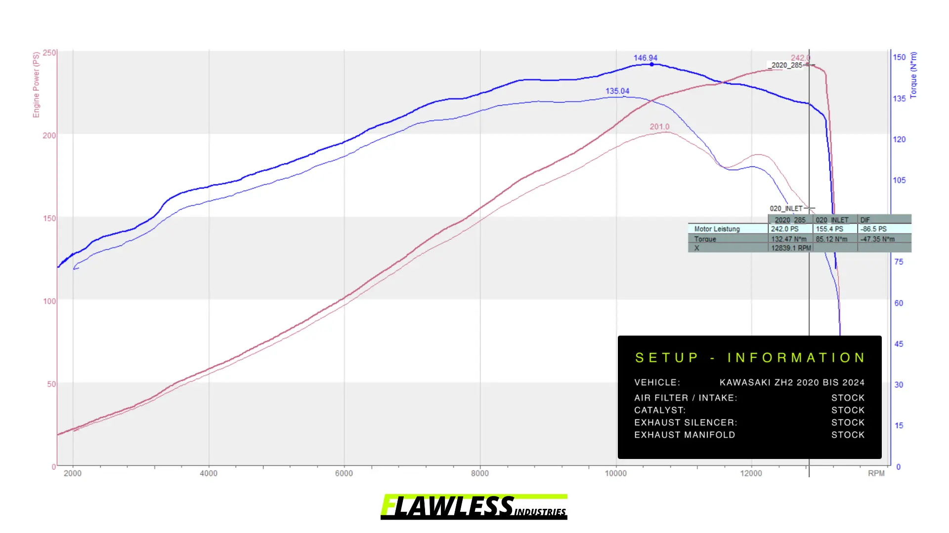 – Performance increase: We write the tuning software or optimization individually for your Kawaski ZH2 2020 to 2024 and adapt it to your installed hardware. As a result, we achieve a power increase from 200 to 240 hp and 135 to 146 NM torque. The power of the ZH2 is limited in the upper speed range from 11,000 rpm. We remove this throttle so that we achieve up to 85 hp more power and 50 NM more torque. In addition to the extra power, our FLAWLESS ECU Performance Flash improves drivability: the power delivery of your ZH2 becomes significantly more homogeneous and consistent. The annoying constant jerking of your Kawasaki has also completely disappeared after the ECU optimization, giving you a significant increase in rideability. We adjust the injection maps so that the air-fuel ratio values of your ZH2 are now in the optimum range. This also reduces the thermal load on the exhaust valves and cylinder heads thanks to the resulting lower exhaust gas temperatures.